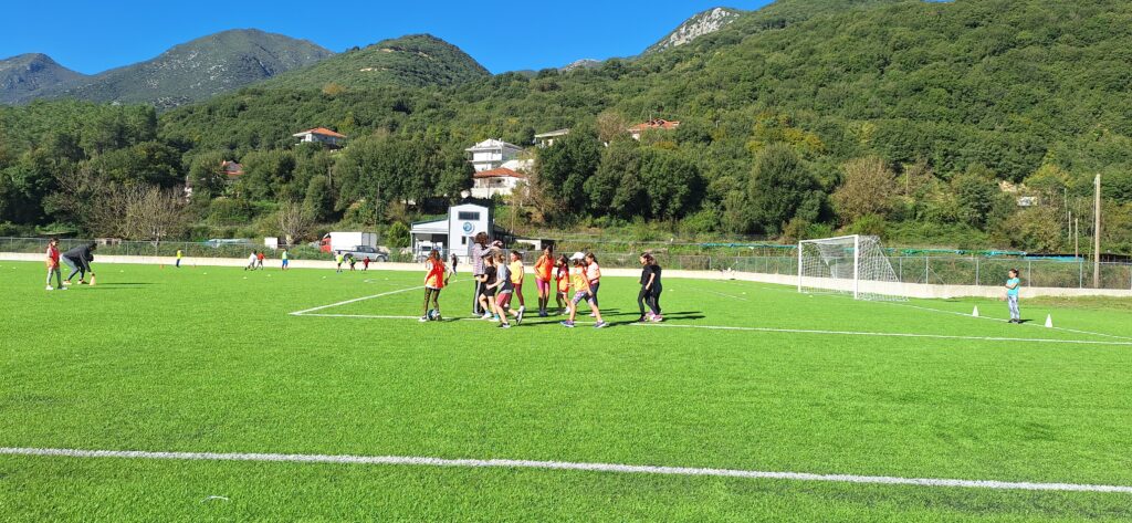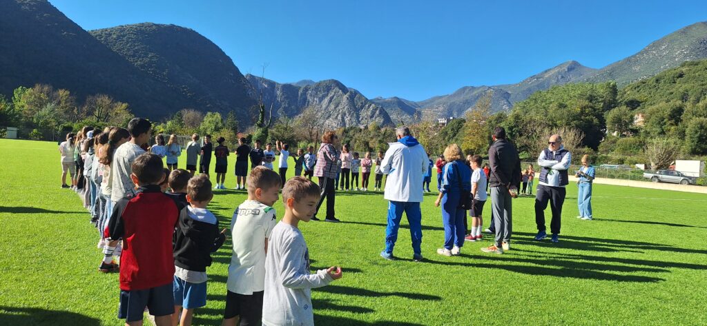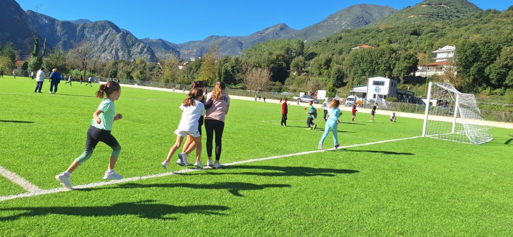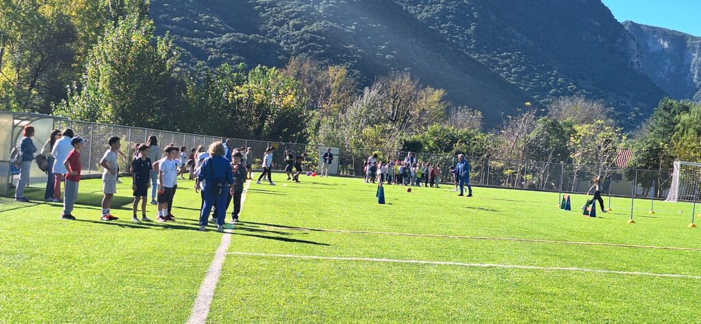 Εμείς συναντηθήκαμε με μαθητές και μαθήτριες από άλλα σχολεία σε ένα ωραίο γήπεδο ποδοσφαίρου. Εκεί υπήρχαν γυμναστές και άνθρωποι του αθλητισμού. Μας μίλησαν για τις αξίες του αθλητισμού και στη συνέχεια αθληθήκαμε σε ποικίλα αθλήματα.
